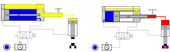 氣液增壓器與增壓缸區別系為分體式,油缸分開并可任意角度安裝。操作原理與增壓缸相同:系靠兩個載面積不同之活塞,利用氣源壓力(P1)推動大面積活塞(A1),由小面積(A2)推動另一端的液壓油,繼而使另一活塞(A3)之活塞桿抵觸工件,缸體內液壓油澎脹從而產使高壓達到成型目的。(如上圖)